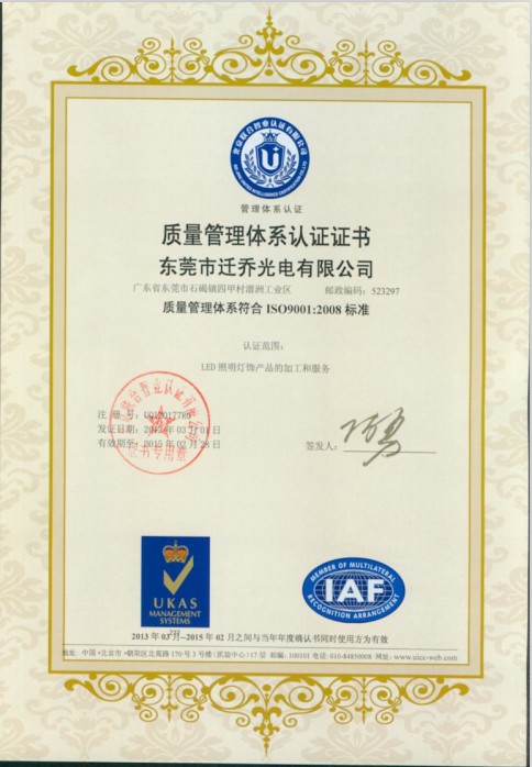 熱烈祝賀東莞市遷喬光電有限公司ISO認證順利通過